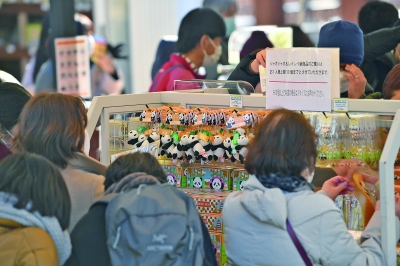 图②:1月12日,游客在日本东京上野动物园参观大熊猫后选购大熊猫纪念品。 (新华社发)
