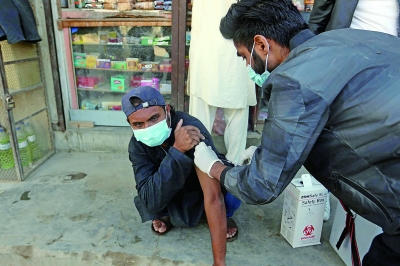 1月11日,在巴基斯坦南部港口城市卡拉奇,医护人员在一处街区挨家挨户为市民接种疫苗。(新华社发)