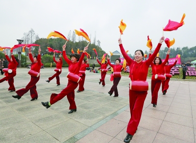 倡 导 移风易俗 2月10日,市广场健身舞运动协会的志愿者们来到龙背山森林公园,开展“春行万里、舞动‘宜风’”移风易俗树新风活动,通过三句半、舞蹈、小品、快板等形式,向市民、游客宣传文明新理念,倡导社会新风尚。 图为活动现场。 (记者 蒋 瑜 摄)