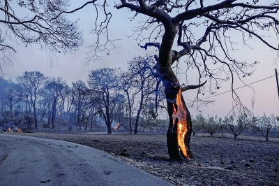 由于连日遭遇极端高温,希腊首都雅典郊外7月17日发生两起野火,导致数以千计人员疏散。按照美联社的说法,虽然当天气温有所降低,但希腊南部大部分地区处于火灾风险警戒级别,预计20日开始遭遇更极端的高温。图为7月17日在希腊雅典郊外卢特拉基附近拍摄的燃烧着的树木。(新华社发)