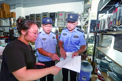本报讯(见习记者谷 雨 通讯员杭 露/文 通讯员王 杰/摄) “老板,您店里卖刀身长度超过220毫米的刀具吗?管制刀具的标准您知道吗?” “没有,我们店里早就不进那种货了,我们只卖合规的菜刀,派出所的同志经常来给我们做这方面宣传,哪些是管制刀具,我们都知道的。”7月12日,市公安局扎实推进“太湖鹰击2号”专项行动,在全市范围内开展清缴整治管制刀具专项行动。