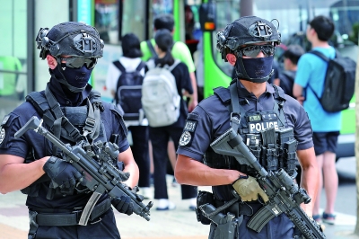 图为8月6日,全副武装的特警在韩国首尔江南区街头巡逻。(新华社发)