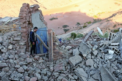 图为当日,在摩洛哥马拉喀什附近,居民查看遭地震损毁的建筑。
