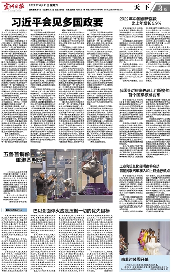 习近平指出,今年春天卢拉总统对中国进行成功国事访问,我同他举行了富有成果的会晤,就引领开辟新时代的中巴关系达成重要共识。中国和巴西分别是东西半球最大的发展中国家,是具有全球影响的新兴大国。面对变乱交织的世界,中巴理应坚定相互支持、彼此呼应。“一带一路”倡议同巴西“再工业化”和新版“加速增长计划”高度契合,完全可以实现对接,助力各自现代化进程。中方支持巴西明年主办二十国集团领导人峰会以及后年举办《联合国气候变化框架公约》缔约方大会,愿同巴方加强协调配合。