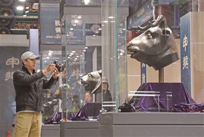 图为10月20日,观众在“五首重聚·故园新语”圆明园兽首铜像特别展览上拍摄。