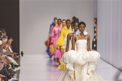 图为当日,在南非约翰内斯堡,模特在时装周上展示The Bam Collective品牌的作品。(新华社记者 张誉东 摄)
