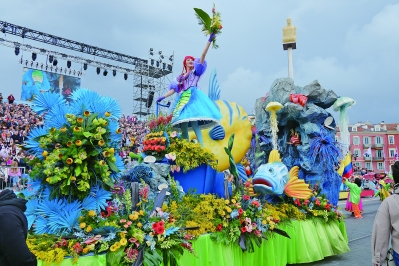 大图为3月2日,演员在法国尼斯狂欢节上参加“鲜花大战”。