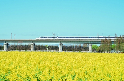 小图为日前,一列高铁在丁蜀镇莲花荡农场的油菜花田旁疾驰而过。