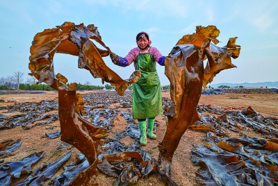 小图为4月8日,在山东省荣成市爱伦湾海域沿海一处海带晒场,养殖工人在晾晒海带。(新华社发)