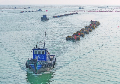 大图为4月8日,在山东省荣成市俚岛湾海域,养殖工人驾驶满载海带的渔船返回码头(无人机照片)。
