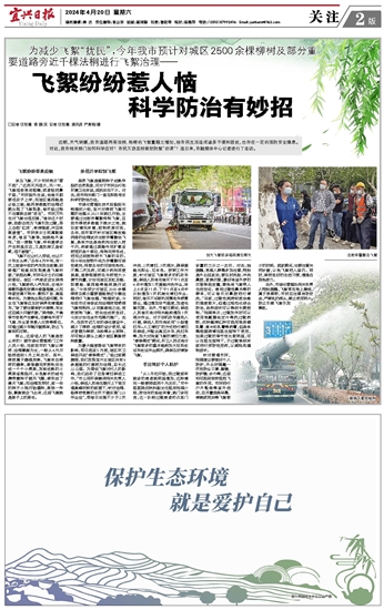 虽然飞絮是植物种子成熟炸裂的自然现象,可对于市民出行和环境卫生来说,困扰实在不少。对此,我市相关部门一直在积极寻求科学的防治办法。