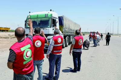 6月4日,35辆装载约500吨食品和医疗物资的卡车从伊拉克启程前往加沙地带,以帮助当地受困的巴勒斯坦民众。(新华社发)