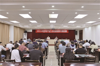 本报讯 日前,市产改办举办2024年宜兴市产业工人队伍建设改革专题培训班,市产改联席会议成员单位分管负责同志、联络员,环科园产改办负责同志,各镇(园区、街道)总工会专职副主席,宜兴工匠学院建设单位负责同志,部分产改试点企业工会负责人等40余人参加培训。市总工会党组书记、副主席,市产改办主任邱远远作开班动员,市总工会党组成员、副主席朱明婷主持开班仪式。