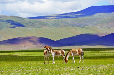 远山如黛,湖岸芳草萋萋,野驴三五成群。