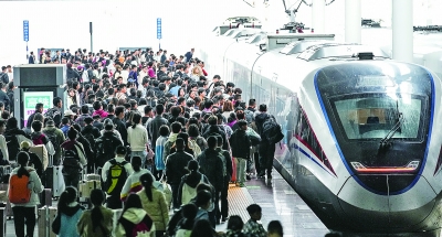 图为10月7日,旅客在贵阳北站站台准备乘车。 (新华社记者 陶 亮 摄)