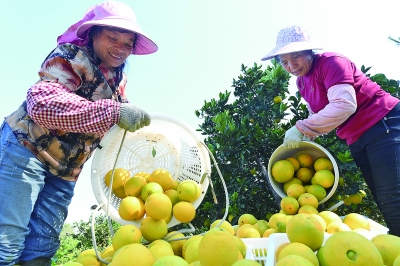 在江西省赣州市于都县段屋乡金屋果业基地,果农收获赣南脐橙(2023年11月1日摄)。(新华社发)