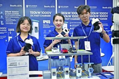 为期3天的2024马来西亚智慧国家展11月19日在吉隆坡马来西亚国际贸易展览中心开幕,50多家中国通信技术与科技创新企业携诸多创新成果亮相。图为19日,深圳英飞源技术有限公司亚太区销售总监迟源(中)在2024马来西亚智慧国家展的展位工作。(新华社记者 程一恒 摄)