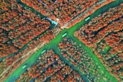 初冬时节,安徽省宣城市宁国市方塘乡的2000余亩红杉林层林尽染,进入一年中最美的时节,游客泛舟水上,宛若在画中游览。