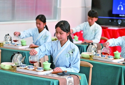 图为在梧州市苍梧县六堡镇塘平小学,学生在学习茶艺(12月3日摄)。(新华社记者 黄孝邦 摄)