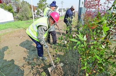图为日前,工作人员正在范蠡大道进行绿化作业。(记者 翟霄帆 摄)