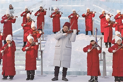 1月12日,哈尔滨冰雪大世界园区上演音乐“快闪”,为即将到来的亚冬会助力。