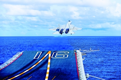 训练期间,外军舰机多次抵近侦察、跟踪监视,编队全程保持高度戒备、随时反应的作战状态,多次组织舰载机战斗起飞,专业稳妥处置应对。图为舰载战斗机滑越起飞。 (新华社发)