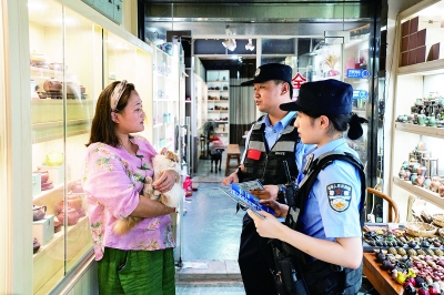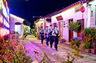 “老板,晚上离店要锁好门窗,注意防骗防盗。”伴随着闪烁的红蓝警灯,丁山派出所民警陈皓元带领队员穿行在古镇人流中,提醒沿街商铺和住户,提高防范意识,给群众带来“看得见”的安全感。入夏以来,市公安局结合夏季人员活动的规律特点,严格落实巡逻防控机制,按照“多警种、全时空、全覆盖”和控制点、线、面总体要求,最大限度把警力摆上街面沉入社区,加大夜间经营的夜市、餐饮、娱乐等重点场所、重点部位巡逻力度、频次,最大限度提升见警率、管事率,有效防范和震慑违法犯罪活动,确保全市社会面持续安全稳定。