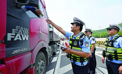 连日来,市公安局交警大队开展交通安全整治行动,重点查处以货车严重超载、非法改装、疲劳驾驶和轻型货车违法载人等4类交通违法,校车超员、不按审核线路行驶和接送学生车辆超员、非法改装等4类重点交通违法行为。图为9月11日,执勤民警在苏皖两省交界的342省道检查车辆。(通讯员 赵振伟 摄)