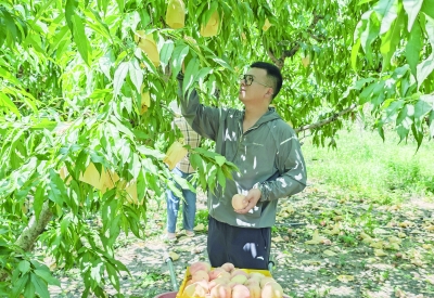 7月30日,位于太华镇的市悦程生态家庭农场内,工人们正忙着采摘成熟的水蜜桃。该农场种植京红、白凤、湖景等品种的水蜜桃共40多亩,今年受暴雨等天气影响,产量略有下降,亩均产量1000公斤左右,亩均产值1万余元。通过“线上+线下”销售模式,农场的水蜜桃供不应求。