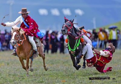 7月30日,四川省理塘“八一”赛马会在多旺塘赛马场启幕 ,来自全县各乡镇近千名牧民会聚一堂。赛马会上表演的拾哈达、马上射击、马上射箭、镫里藏身、五彩凌空等马术绝技,让当地牧民和游客享受了一场视觉盛宴。