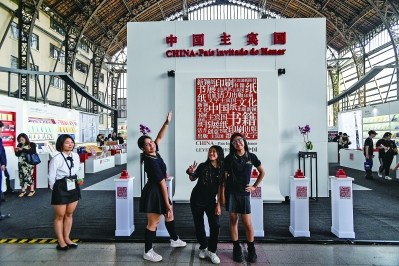 图为11月8日,在智利圣地亚哥马波乔艺术文化中心内,当地民众在第43届智利圣地亚哥国际书展中国展区拍照留念。 (新华社发)