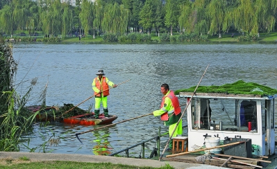 图为日前,保洁人员正在大溪河水域打捞水草。(记者 翟霄帆 摄)