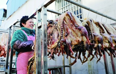 新年临近,市民纷纷开始着手准备年货。12月17日,在杨巷镇新芳菜场附近,经营户们趁着晴好天气,忙着晾晒灌好的香肠,腌制好的猪肉、鸭、鹅等,萦绕着幸福的味道。(通讯员 龚建平 摄)
