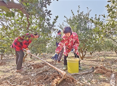 图①为2月18日,位于丁蜀镇的市马面山生态农业观光中心内,员工开展施肥、修枝作业。