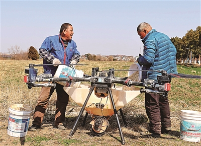 图②为2月18日,位于杨巷镇西溪村的农田边,农户为麦苗进行无人机施肥。