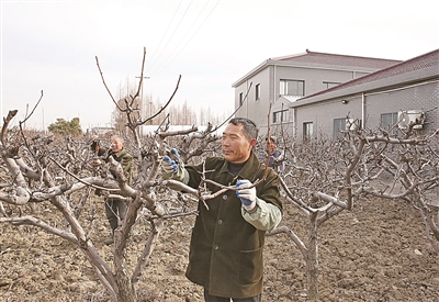 图③为2月17日,位于周铁镇的市颖丰生态果园内,果农在修剪梨树枝。