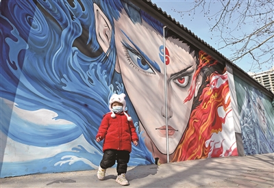 图为2月19日,小朋友在石家庄市裕华区富强大街与塔南路交口处哪吒主题墙绘前拍照。(新华社发)
