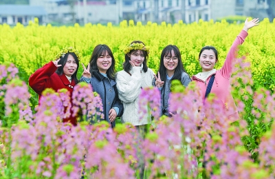 图为3月12日,游客在重庆潼南崇龛花海景区游览、拍照。
