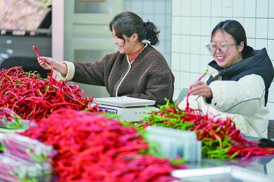 图为3月12日,在湖南省浏阳市葛家镇的鸡肠子辣椒分拣中心,工作人员在分拣辣椒。