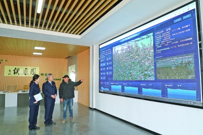 大图为税务人员通过数字化大屏了解蓝莓智能灌溉、环境监测等系统运行数据。