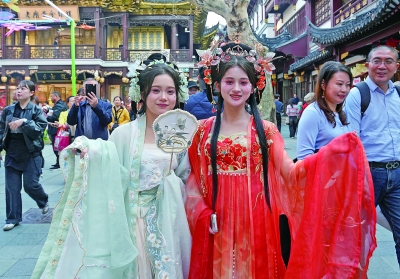 图为 20日,两名日本游客穿着国风服饰在豫园商城游玩。