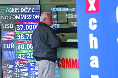 图为3月19日,一名男子在土耳其安卡拉的一家外币兑换点办理业务。(新华社发)