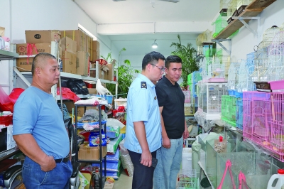 图为当天,执法人员在位于宜城街道的花鸟市集核查在售鸟类的品种与来源资质。(记者 孙 铱 摄)