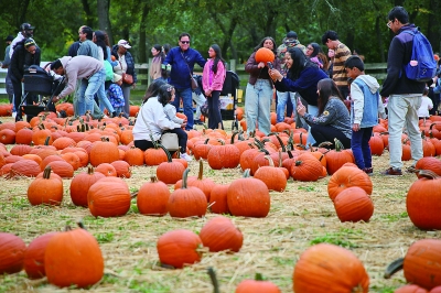 10月11日,人们在美国纽约南瓜集市上观赏、挑选南瓜,庆祝金秋和丰收,为即将到来的万圣节做准备。
